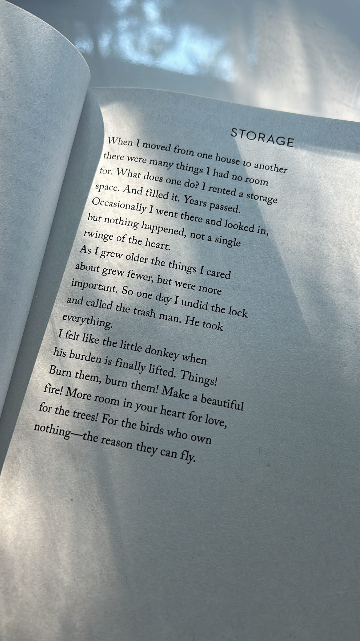 I read this poem by Mary Oliver not long ago and I’ve revisited it a handful of times since. Something about her words make me feel lighter just by reading them. They made me think about MY storage unit, the one I’ve been paying Stack n’ Store $170 a month for.